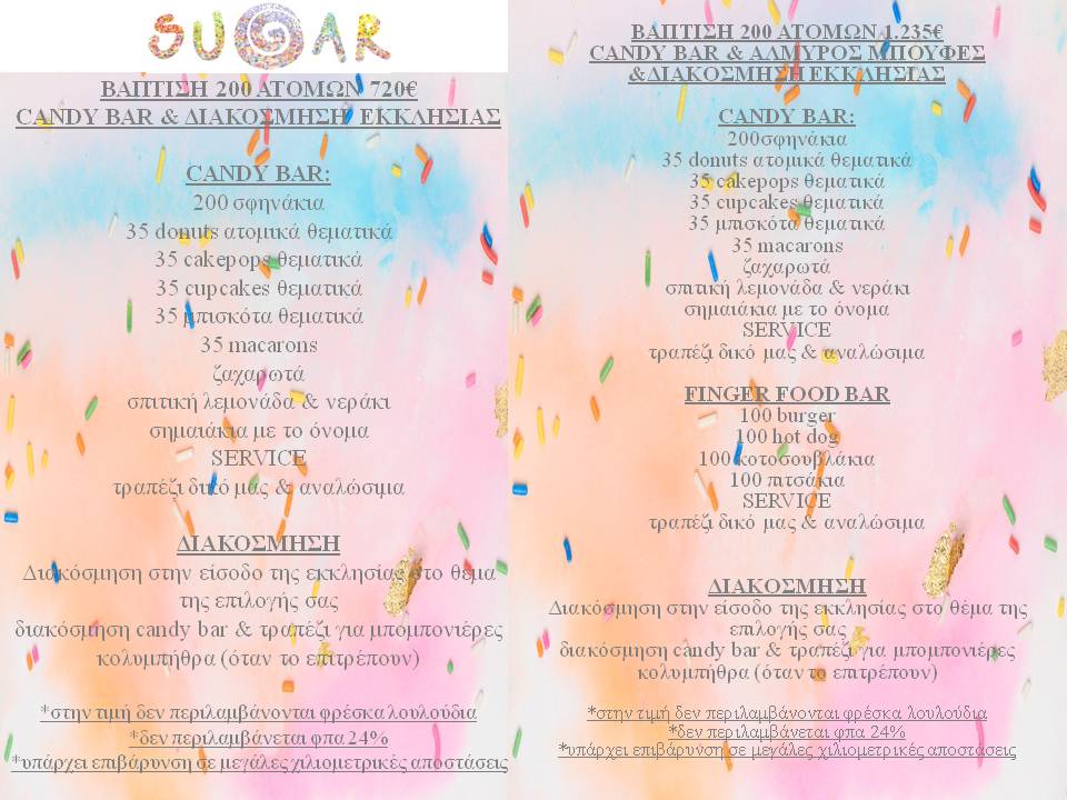 Μοναδικές προσφορές βάπτισης του SUGAR by Miranda για όσους κλείσουν μυστήρια μέχρι 15 Ιουνίου 2023.Οι προσφορές ισχύουν για όλες τις ημερομηνίες του 2023 μέχρι εξαντλήσεως όλων των διαθέσιμων ημερομηνιών. Επικοινωνήστε στο 210-4913274 & 6944534890 ή στείλτε μας στο info@sugar-shop.gr